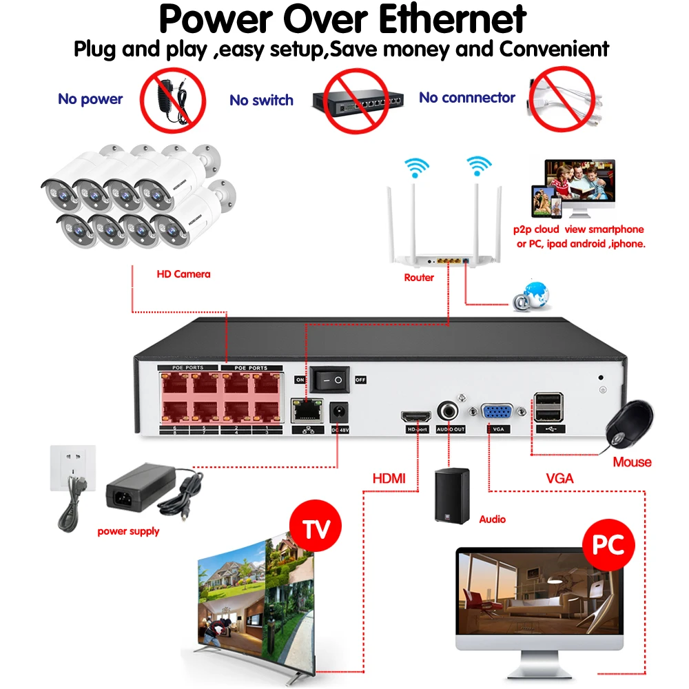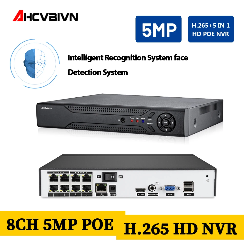 AHCVBIVN H.265 H.264 8CH 48V POE NVR 5MP/4MP/1080P Audio Out Surveillance Security Video Recorder F